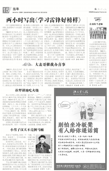 《学习雷锋好榜样》这首歌,是我用两个小时创作出来的。 1963年3月5日,《人民日报》发表了毛主席亲笔题词的“向雷锋同志学习”。中央领导人分别为雷锋题词,号召全国人民学习雷锋的共产主义精神品质。当天上午,我所在的北京军区战友文工团在学习题词,下午还要向群众宣传学习。会上有人提议,文工团应该拿出一首学习雷锋的歌曲来唱。大家想到了创作组的娄生茂(笔名生茂)和我,让我们创作一首群众歌曲。当时是上午十点,我还在学习就被叫了出来,让我赶紧写词去,下午两点就要上街宣传了。 接到这个任务,我的第一反应是很兴奋。可等我一个人在小屋子里坐下,突然就觉得傻眼了:“怎么把一个英雄的事迹变成一首歌,这首歌还能让大家唱起来?”我把和雷锋有关的材料铺了一桌子,有报纸题词,有雷锋的事迹,还有雷锋获得的各种荣誉。我忽然想起来,榜样的力量是无穷的,毛主席题词就是为大家树立了一个榜样。我心中一动,把所有的材料分门别类整理一遍,领导的批示放在一起,群众的反响放在一起,群众学习雷锋精神的感受也放在一起。我把它们综合一下,歌词就很容易写出来了。我写完词,刚刚过了两个小时。已经到了中午,我赶紧把歌词给了作曲家生茂,生茂顾不得吃饭,也钻到小屋里创作。 除了《学习雷锋好榜样》,我另一首广为人知的歌曲是《北京颂歌》。这首歌创作于1971年,但它的灵感来源其实在1964年前后。那时,我到天安门警卫连体验生活,当了半年兵。我最难忘的一个岗位,就是黎明之前站在金水桥上的那班岗……1971年,作曲家田光接到总政歌舞团领导的任务,写一首北京题材的独唱歌曲。他与我以及作曲家傅晶在家讨论。那时候,很少有人敢写抒情歌曲。我们三个人胆子大,接下任务就写,最终成就了《北京颂歌》。(讲述/北京 吴洪源 93岁 整理/韩轩)