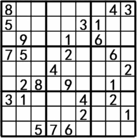 填入数字1至9,使每行、每列、每个粗线围成的3×3的宫都出现1—9且不重复。