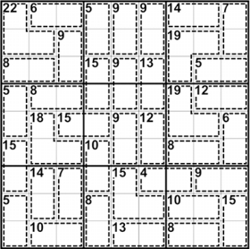 杀手数独:将数字1—9填入空格内,使每行、每列和每宫内的数字均不重复。虚线框内提示数表示框内所有数字之和,同虚线框内不能填入相同的数字。