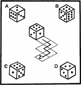 图中央的骰子若按箭头方向连续滚动到Z,此时骰子的三个面应该是?