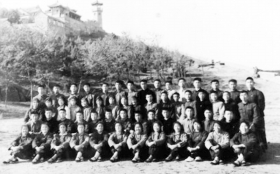 当时,我和另一位男同学轮流带一个女同学。公路坑坑洼洼,从学校到城里还大多是山路,遇到上坡骑不动,只得下车推着走。我们费了近四个小时才赶到城里,我们两个男同学累得汗流浃背,坐在车座上的女同学也被颠簸得腰酸臀疼。照了毕业照后,当天下午,同学们每人花五分钱买了蓬莱阁门票,游览蓬莱阁,并留下了这张留影。(山东烟台 王慧敏 67岁)