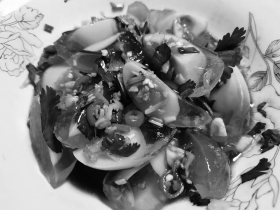 凉拌菜首先要调好料汁:大蒜四五个,生姜一块,拍破切末;小米椒两三个,切碎;香菜几根,切段。将以上小料放碗中,加入适量食盐、鸡精(鸡粉)、白糖,倒入生抽、陈醋、芝麻香油,也可再加入山胡椒油等增添风味,化开调料,搅拌均匀。然后,把变蛋切成适当大小,浇入料汁拌一拌即可。