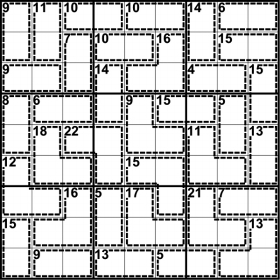 请将数字1—9填入空格内,使每行、每列和每宫内的数字均不重复。虚线框内提示数表示框内所有数字之和, 同虚线框内不能填入相同的数字。