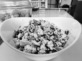 掌勺人 胡萍,辽宁铁岭,70岁 菜品特色 好看鲜美,口感爽脆 茼蒿味道甘美,可滋润肺部、利肠通便,还能安神健脑。茼蒿拌豆腐,好看好吃又好做,营养互补。 先将豆腐焯水,放凉。茼蒿洗净焯水后马上过凉水,切末,放入豆腐中。准备一碗料汁:葱末和干辣椒用热油炸香,加盐、味精、白糖、一点点香油(也可以不加香油,把芝麻擀碎放入)。将料汁倒入豆腐、茼蒿中,把豆腐抓碎,拌匀。豆腐白而软,茼蒿绿而脆,一道特别好看鲜美的减脂菜就做成了。 欢迎扫描二维码(5月27日前有效)加入“快乐家美食”微信群,在线投稿、交友。