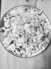 掌勺人 范全良,河南焦作,64岁 菜品特色 馍头新吃,香味四溢 馒头变硬了,怎么办?炒一炒,也是一道美味。 先把馒头切片,改刀成丁。鸡蛋两个打散,炒成鸡蛋碎,放入切好的葱姜蒜炒出香味,倒入青菜——芹菜、菠菜均可,加适量食盐翻炒3—4分钟,随后倒入馒头丁,转中小火炒上2分钟左右,让鸡蛋、青菜与馒头充分接触。最后,淋上调好的料汁,翻动几个来回就可以了。我用的料汁,是自己熬制的花椒大料茴香水,加了点酱油、鸡精。 这样炒的馒头,黄绿白各色搭配,馍头不软不硬,香味四溢,适合早晚餐配汤吃。