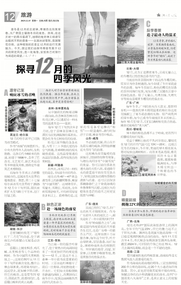 凛冬是12月的主旋律,寒潮自北向南席卷,为广袤国土铺就冬日的底色。然而,在这片统一的寒冷基调下,地理的鬼斧神工却谱写出截然不同的景象——北国冰封雪飘,南国繁花仍俏。这种极致的反差让12月的出行充满魅力。今天,就让我们去探寻那些专属于12月的限定风光,选一处角落,安放自己对旅行与闲适的渴望。(文/广平) 凛冬已至 响应冰雪的召唤 南方人对于冰雪世界的向往热烈执着。据往年数据,在北上追雪的预订用户中,南方游客占比超七成,其中是否有你呢? 黑龙江·哈尔滨 12月的哈尔滨早已切换为冰雪模式。 作为“冰城”的颜值担当,中央大街终年人流如织,生机勃勃。这条长约1450米的街道,始建于1898年,荟萃了巴洛克、文艺复兴、新艺术运动等多种建筑风格,堪称室外建筑艺术博物馆。 而每年冬季真正点燃整座城市的,还属冰雪大世界的璀璨盛宴。据悉,第二十七届哈尔滨冰雪大世界将于2025年12月中下旬开园,园区面积扩大至120万平方米,创下历届之最。 吉林·吉林雾凇岛 从中国最北的极寒边陲一路向南,在吉林省吉林市的松花江畔,可以遇见另一种冰雪的温柔形态——雾凇。 每年12月下旬到次年2月底,位于吉林省吉林市龙潭区乌拉街满族镇的雾凇岛,便会化身为玉树琼花的仙境。 松花江面升腾的袅袅水雾,与零下二十多摄氏度的冷空气相遇,在垂柳松柏的枝头凝结成霜。这些晶莹剔透的冰晶层层叠叠,最终绽放出绝美树挂。 新疆·阿勒泰 在西北,冰雪以另一种恢宏的姿态,书写着冬日的传奇。 地处北纬45°—47°黄金滑雪带上的新疆阿勒泰,被誉为“中国雪都”。这里降雪早、雪量大、雪期长、雪质优,全年积雪期210天,平均积雪厚度在2米以上。最难得的是,这里的雪是备受追捧的“粉雪”——轻盈蓬松,滑行时如浮于云端,被誉为雪中极品。 山东·威海 不必远赴北国,在山东半岛最东端的威海,同样能够邂逅大雪纷飞的浪漫。 这座被冷流雪偏爱的海滨城市,因独特的降雪现象,与烟台共同享有“中国雪窝”的美誉。你可以前往那条直通大海的火炬八街,看道路尽头的蔚蓝海平面在雪花装点下,呈现出犹如动漫场景般的清新与治愈。还可以去探访那艘静静伫立于荣成海域的布鲁维斯号沉船,这座巨大的船体在苍茫的海天之间更显孤寂与神秘。 秋色正浓 赴一场颜色的盛宴 当北方大地在12月披上银装,南方的山林却正浸染着一年中最浓烈的秋色。如果你还未来得及细赏北国的秋,是时候南下去追寻这场姗姗来迟的晚秋盛宴。 湖南·长沙 若要领略杜牧笔下“霜叶红于二月花”的诗意,位于湖南长沙的岳麓山无疑是必访之地。 岳麓山上植有枫香、鸡爪槭、北美枫香等七个品种的枫树。作为中国四大赏枫胜地之一,这里的枫叶从11月中下旬开始渐次变色,整片山林由绿渐黄,再浸染为灿红,远远望去,犹如被夕阳点燃。但它的极致,还是要等到12月,那最浓烈、最透彻的红,是岳麓山晚秋的真正高潮。 江苏·常熟 当江南一带的银杏叶掉光了,位于常熟市的尚湖却迎来了一场更加炽烈的视觉盛宴——12月,正是这片水上森林一年中最为浓墨重彩的时刻。三百亩池杉林褪尽了最后一丝青绿,彻底燃烧成一片赤红。它们如火焰般倒映在静谧的湖面上,在萧瑟的江南冬日中,绽放出油画般热烈而持久的生命力。 广东·韶关 虽说已经到了12月,但广东的秋天才刚刚到来。作为广东最早入秋的地区之一,韶关迎来了一年中最美的时节! 作为“岭南银杏之乡”,南雄是国内纬度最低的天然银杏生长区,也是广东唯一的银杏主产区。这里坐拥十万亩银杏林,每年这个时节,叶片由绿转黄,层层叠叠,灿烂如金,堪称岭南秋色的颜值担当。坪田镇的坳背、冯屋、军营寨,以及帽子峰镇等地,都是赏银杏的绝佳去处。 反季春景 追寻最动人的温柔 12月寻芳,并非痴人说梦。当寒潮席卷南北,云贵高原的暖阳里,仍有繁花似锦正在酝酿。这种季节的“错位”,成就了冬日里最动人的温柔。 云南·大理 12月,北方正是萧索寒冬,云南无量山上的冬樱花已经怒放出春天的气息。 当地百姓在茶园间种下的这些冬樱花树,原本只为给茶树遮荫,如今却成了冬日里最意外的浪漫。每年冬至前后,粉色的樱花在层叠的茶田间绚烂绽放,宛如点醒了沉睡在云雾中的绿色波浪。除了无量山,大理古城、大理大学等地也是观赏冬樱花的绝佳去处。 广东·广州 每年冬季,广州的街头行人驻足、摄影师举机——盛放的异木棉用温柔的粉红给这座花城献上了寒冬最浪漫的礼物。原产南美洲的异木棉,如今已成为华南地区年末的标志。每年10月至12月,它们以满树粉花装点街道,被亲切地唤作“美人树”。 四川·攀枝花 异木棉的粉色浪漫不止于岭南,更在四川的攀枝花灿烂绽放。 受益于横断山脉的干热河谷效应,攀枝花在12月的日均气温可达13℃—25℃。这座以花为名的城市,冬日里,美丽的异木棉在街头巷尾绽放出满树粉红。而在米易县易园,紫花风铃木也正值盛期,簇簇粉紫缀满枝头,与异木棉交织出一个粉紫色的冬日梦境。 晴夏延续 拥抱22℃的“冬季” 当北方步入寒冬,中国的南方海岸却依然保留着22℃的蓝色惬意。 广西·北海 地处北纬21°国际滨海旅游带上的涠洲岛,全年平均气温23℃,但它的魅力远不止于阳光沙滩。涠洲岛是我国大陆近海唯一可以稳定观测到鲸鱼活动的海岛。每年11月至次年4月,布氏鲸会如期洄游至涠洲