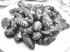 先将茧蛹洗净焯水近10分钟,控干水分,锅里不放油,放茧蛹小火慢炒,将水分炒干后盛出备用。这个过程要耐住性子,大约费时10分钟。然后,锅里放油——比平时炒菜油多一点,放茧蛹,依然用小火慢炒。待茧蛹皮酥脆,再放葱姜蒜盐,煸炒几下即可出锅。