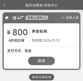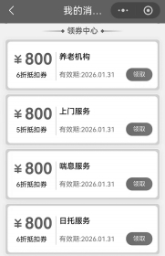 近日,由民政部、财政部联合部署的养老服务消费补贴已经开始发放,全国范围内中度及以上失能老人每人每月最高可省800元(此次补贴项目实施周期为2026年1月至12月)。这项真金白银的福利如何领取?快看下面的示范。(本报记者刘霞) 【领取准备】 养老服务消费补贴券以电子消费券形式发放,领取和核销均需在“民政通”App或“民政通”小程序上完成。建议大家在手机自带的应用商店里下载“民政通”App进行操作。领取基本条件:60岁及以上,中度失能及以上。 【领取方法】 第一步 用代办人的身份证注册账号,需要输入姓名、身份证号码、手机号,并进行人脸认证。 完善基本信息,需要上传身份证正反面照片、填写户籍地址和居住地址等。 温馨提醒:消费券有效期为1个月,当月获得,当月使用,次月失效,每月均需进行操作,代办人最好选择子女。 第二步 填写代办信息(代为办理老年人信息),需要上传老年人身份证正反面照片、身份证和老年人正面的合照、老年人侧面照、老年人生活照。如老年人用自己的身份信息注册并登录,不需要填写代办信息。 第三步 切换人员。 温馨提醒:如老年人用自己的身份信息注册并登录,为自己领取消费券,此步不需要操作。 第四步 领取消费券。 这里需要先预约评定机构上门评估。预约成功后静待评定机构上门即可。评估通过后在App“我的消费券”中可以看到结果。 第五步 选择所需服务进行预约。这里以选择养老机构服务进行示范(最后提交后,由养老机构统一向民政部门申请)。 ① “领取”养老机构券 ② 点击“换券” ③ 选择“现金” ④ 回到“我的消费券”页面点击“查询可用机构” ⑤ 找到养老机构,点击“服务申请” ⑥ 选择时间,“提交”