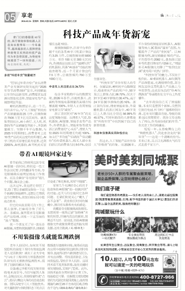 家门口的春联是AI写的,客厅里陪伴型机器人正在向长辈拜年……今年春节,越来越多的人选择把各种新奇又实用的科技产品作为年货带回家,为传统年味增添了一抹科技感。(摘编自潮新闻、央视) 多款“科技年货”销量破万 “回家过年带点啥?”京东消费及产业发展研究院发起的“2026年货节消费调研”显示,科技赋能让年货玩出新花样,消费需求也逐渐向智能化迁移,智能家电等产品销售明显升温。 蝉妈妈数据显示,近一个月,仅抖音平台,与“人工智能”相关的产品销量就超25万件,总销售额在7500万至1亿元区间内。就具体类别而言,AI小夜灯、无人机、机器狗等产品销量位列前十,多款销量破万。另据千牛平台数据,与2025年同期相比,消费者对上述10类产品的关注度均有所增长,AI学习机的买家增长最为显著,达到2205%,AI机器狗、AI耳机的买家增长也超10倍。 按销售额排序,抖音平台单价超千元的各类AI学习机累计售出约3.25万件,总销售额突破5000万元。单价100元至300元区间内,热销商品包括主打“国潮玩具”的机器狗、具备“AI语音”功能的智能音箱等,近一个月累计售出约7.5万件,总销售额约750万至1000万元。 中老年人关注度占比26.72% 综合多家购物平台的数据发现,2026年春节,扫地机器人、洗碗机等智能电器销量在县域市场暴涨超100%,年轻人正在用智能家电替父母“减负”。 浙江省居民对“AI年货”的关注度领跑全国。从搜索人气看,除机器狗、AI眼镜、智能手表等产品外,炒菜机器人、智能床垫等成为浙江消费者的“心头好”,搜索人气较2025年同期增长均超100%。如主打“多功能”“自清洗”“自动翻炒”的炒菜机器人,购买人群中来自浙江的消费者占比9.51%,位居全国首位。 “科技年货”并非年轻人的专利。全国层面,蝉妈妈平台数据显示,检索相关产品的用户中,50岁及以上群体占比26.72%,仅次于31岁至40岁群体的30.47%,高于24岁至30岁群体的20.16%。浙江省内方面,搜索智能床垫、外骨骼机器人的浙江网友中,40岁及以上人群占比分别达56.99%和45.57%,不同年龄段的人群都能在“科技年货”中找到属于自己的新春惊喜。 科技年货兼具实用和性价比 在过去,人工智能产品往往给人“价格贵”的印象。而2026年,不少省份将智能家居机器人、AI眼镜等纳入3C数码“国补”范围,大幅提升了产品的“亲民度”。以AI眼镜为例,淘宝销量前10的产品,平均售价约2082元,叠加浙江国补等优惠后降至约1256元,“用国补买AI眼镜太划算了”“性价比拉满”成为用户的热门评价。 “科技年货”的魅力,不仅在于性价比。AI桌面机器人、AI玩偶等产品颜值高,充满情绪价值,部分网友还给这类机器人产品换上马年装饰等,由此衍生出的“给AI玩偶换装”等话题在社交平台上热度攀升。 “去年我给自己买了智能眼镜,本来只是想图个新鲜,没想到它接打电话、听书听广播都特别丝滑,还有实时翻译功能,导航的效果也比预期要好。我给父母也购入了两台,作为送给他们的年货。”在北京工作的杨谦说。 短短一年,从春晚舞台上的“秧歌机器人”,到走亲访友的“新年货”……这是一个清晰的信号:未来已来,且正以充满烟火气的方式走进千家万户。